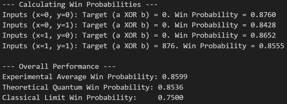 print(f"\nClose, but no cigar? Your result ({avg_win_prob:.4f}) is around the classical limit ({P_win_classical_limit:.4f}).")